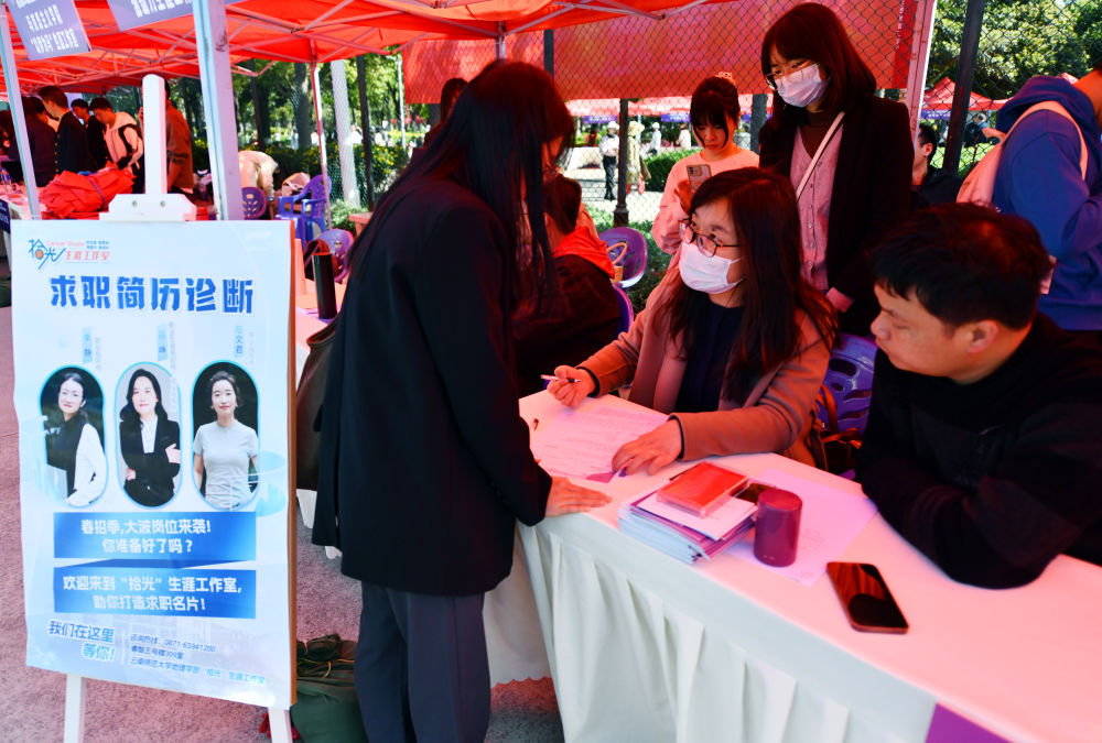 “重要的实习经历要往前放,突出自己的优势。”在招聘会现场的“求职加油站”,云南师范大学的就业指导师吕峥正在为前来咨询的学生修改简历,用笔标注需要注意的细节。