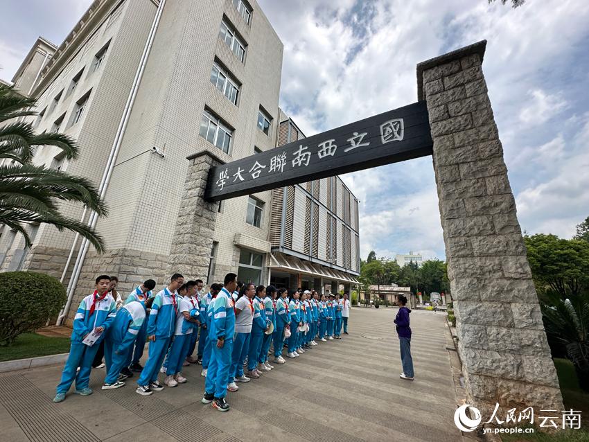 同学们在西南联大仿制门下聆听讲解。人民网 曾智慧摄