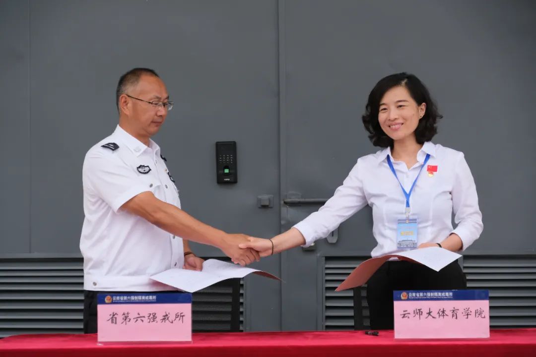 6月23日,云南省第六强制隔离戒毒所、云南师范大学体育学院签署合作框架协议书,并挂牌成立“运动戒毒研究基地“和“教学研究实习实践基地”。云师大体育学院党委书记华致雄、院长闫静,省六所党委书记、所长赵开锋,党委副书记、政委杨茂辉,出席签约和揭牌仪式。