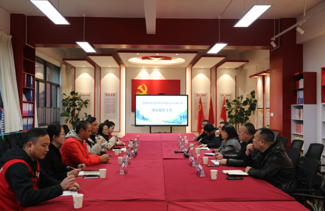 随后,考察团一行到学校党员活动室进行深入交谈,学校相关领导详细介绍学校课后服务体系的设计与实施,双方就开展过程中的问题,从学生、教师、家长、社区等多个层面进行现场交流互动。