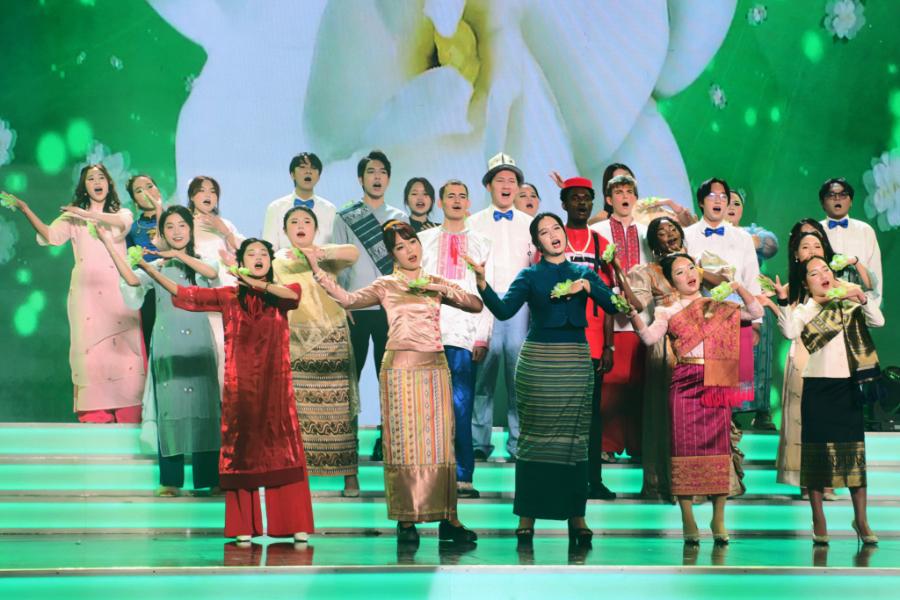在第三篇章《筑梦·四海放歌》中,云南师范大学“和声国际”合唱团演唱了《茉莉花》,这支合唱团成立于今年10月,由12个国家的60余名中外学生组成;《“一带一路”·歌舞相和》舞蹈表演,讲述了36名留学生的故事;舞蹈《风·雅·韵》,通过艺术的形式,带领观众一同领略诗词歌赋里的国风雅致,品味中国文化的博大精深。