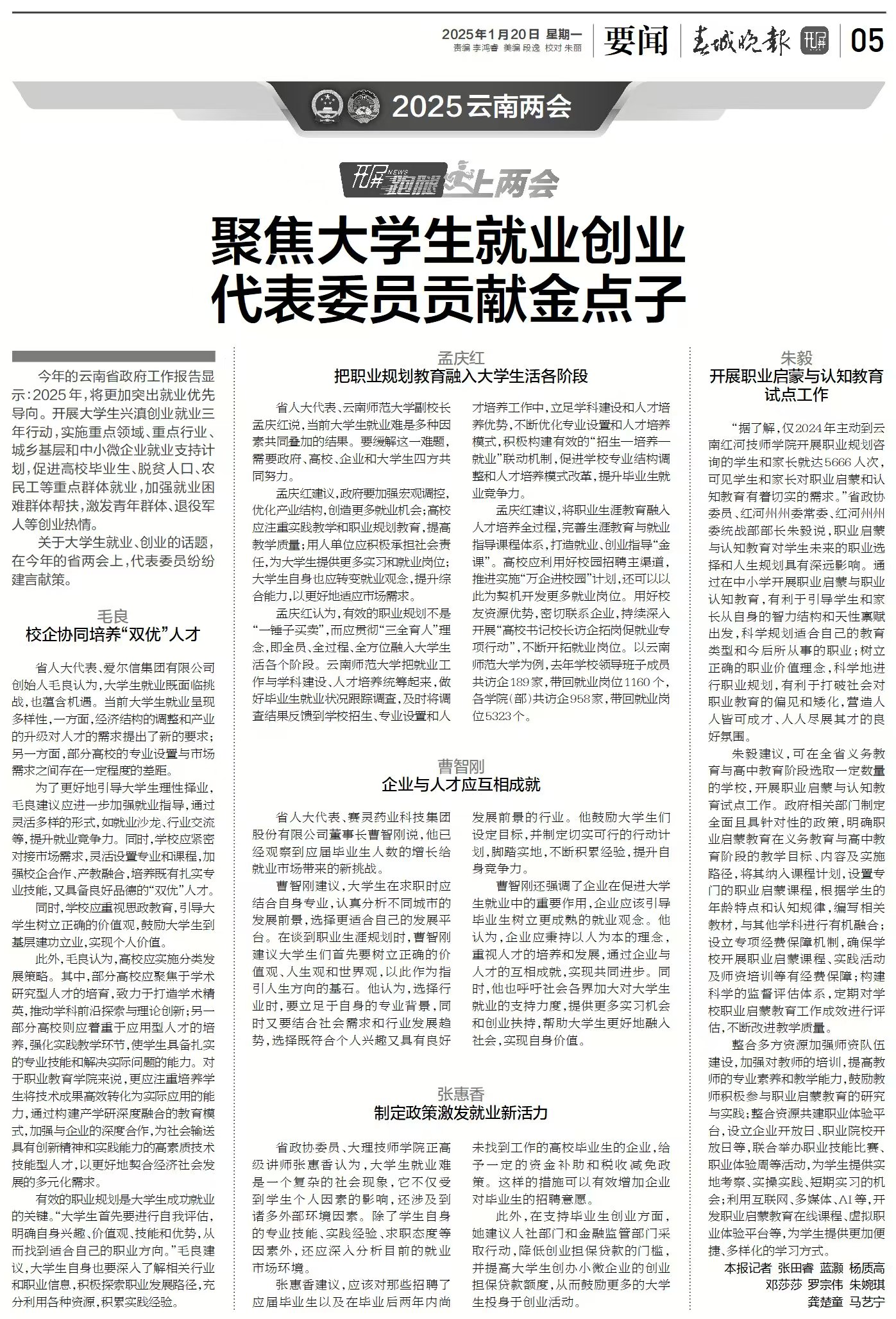 春城晚报 2025-01-20 聚焦大学生就业创业代表委员贡献金点子