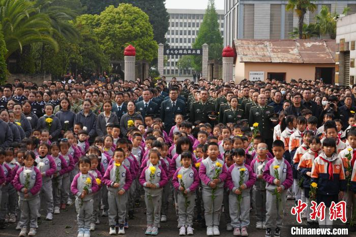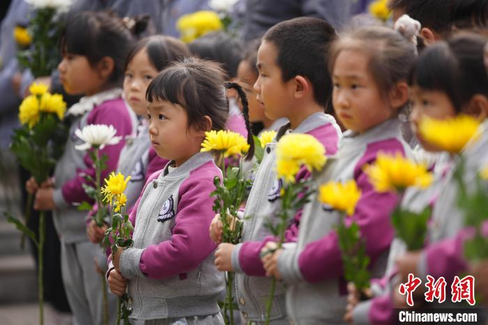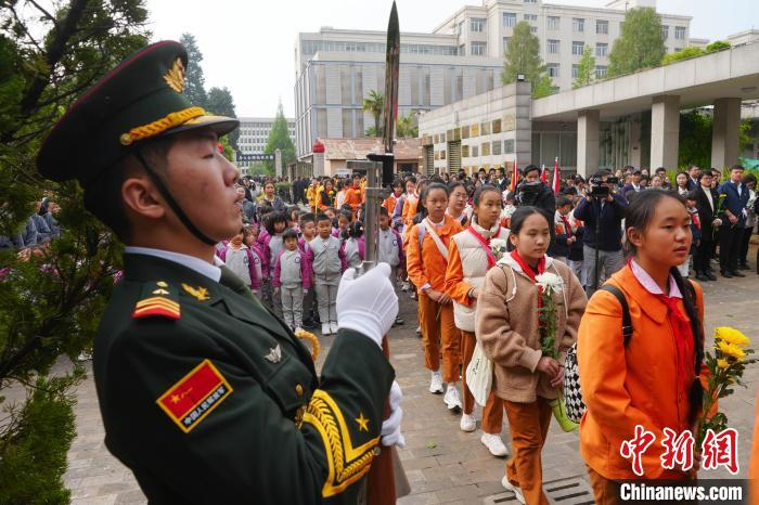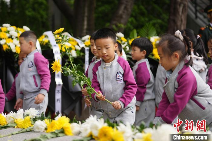 4月3日,云南昆明,幼儿园小朋友排队向烈士敬献鲜花。当日,社会各界人士齐聚云南师范大学,在西南联大旧址的 "一二·一" 四烈士墓前,举行 "清明祭英烈" 活动,共同追思为民族独立、人民解放而献出生命的烈士们。中新社记者 刘冉阳 摄