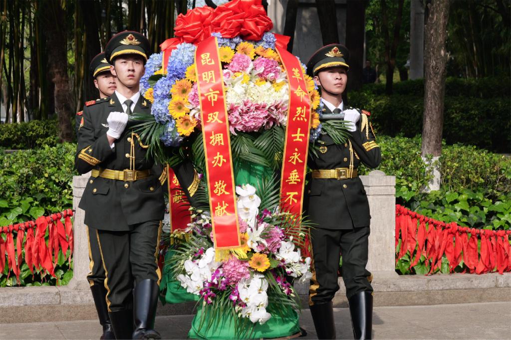 伴随《献花曲》,仪仗队向烈士敬献花篮,昆明警备区司令员张钦锋,昆明市委常委、昆明警备区政治委员吴正良,昆明警备区副司令员谭仲春,昆明市退役军人事务局局长朱伟上前整理缎带,缎带随风飘动,寄托着对先烈们无尽的追思。