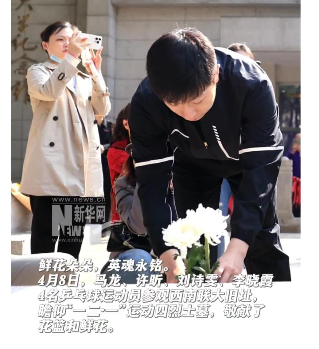 鲜花朵朵,英魂永铭。4月8日,马龙、许昕、刘诗雯李晓霞4名乒乓球运动员参观西南联大旧址,瞻仰了“一二·一”运动四烈士墓,敬献了花篮和鲜花。(完)