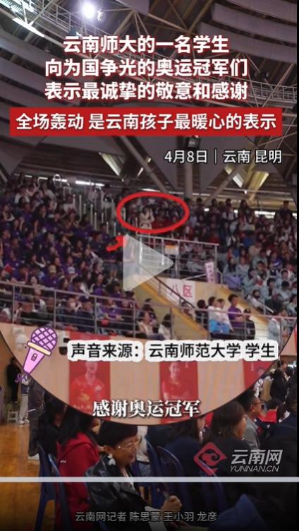 云南师大的一名学生向为国争光的奥运冠军们,表示最诚挚的敬意和感谢,全场轰动是云南孩子最暖心的表示! (云南网记者 陈思蒙 王小羽 龙彦)