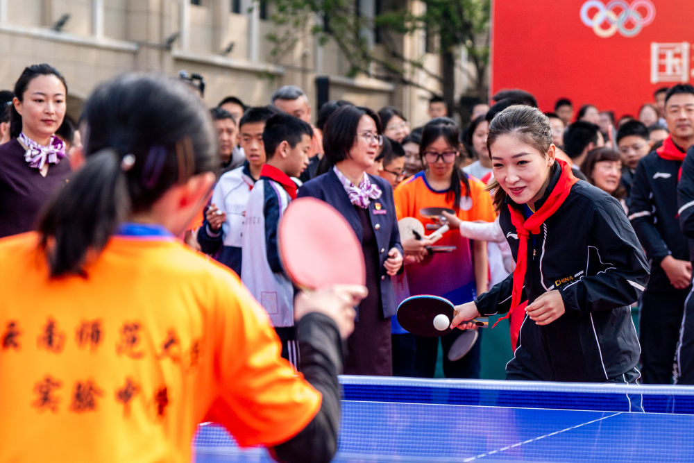 4月8日,刘诗雯与云南师范大学实验中学学生进行乒乓球友谊赛。新华社记者 胡超 摄