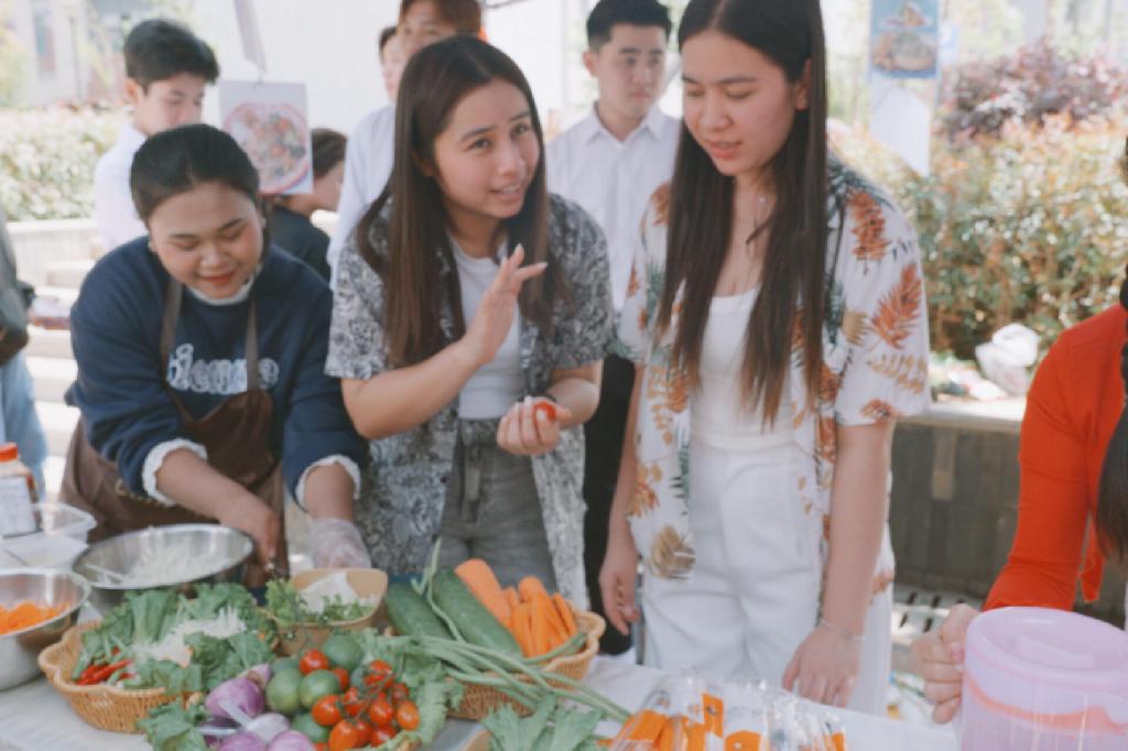 据悉, 参加此次活动的留学生大多已经在云南留学2—3年,中文基本能听会说,而第十组摊位上的几个泰国留学生在交流时会相互帮忙解释中文的意思,据了解,他们一行13个同学都来自泰国素叻他尼府,刚到云南师范大学6个月,学习的是两年制的汉语教育,所以中文表达上还有一些障碍,但在现场的美食推广中,几位同学都不遗余力的介绍着家乡的美食,连比带划的样子让摊位成为了美食节上醒目的一角。