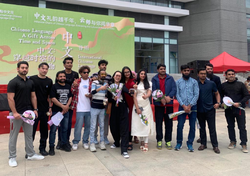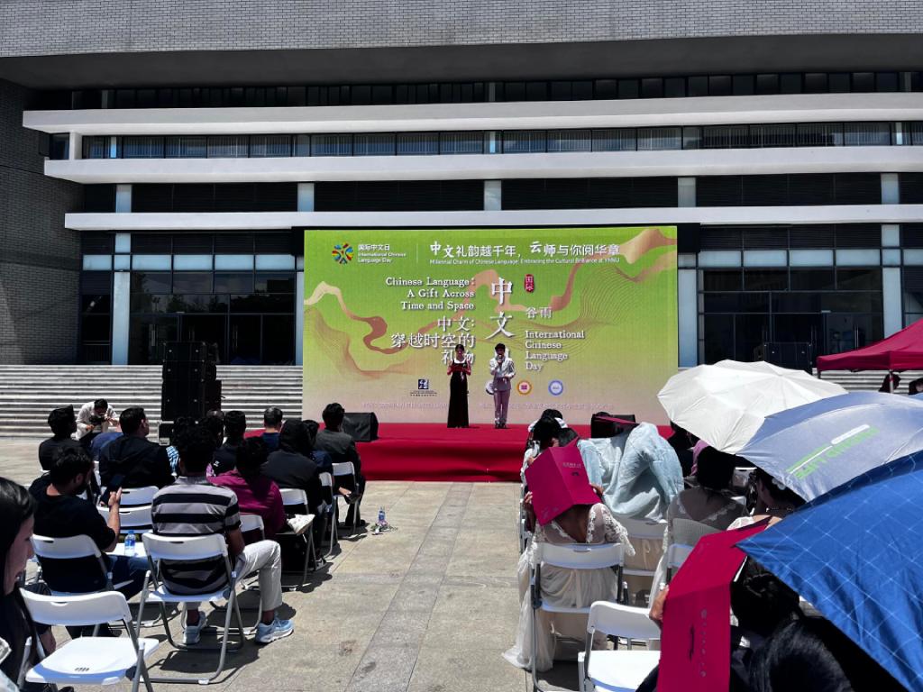 4月17日,“2025年国际中文日——中文:穿越时空的礼物”庆祝活动在云南师范大学呈贡校区东区学生活动中心小广场举行。来自云南师范大学、云南大学、昆明理工大学、云南民族大学、昆明医科大学五所大学的近百名留学生参加庆祝活动。