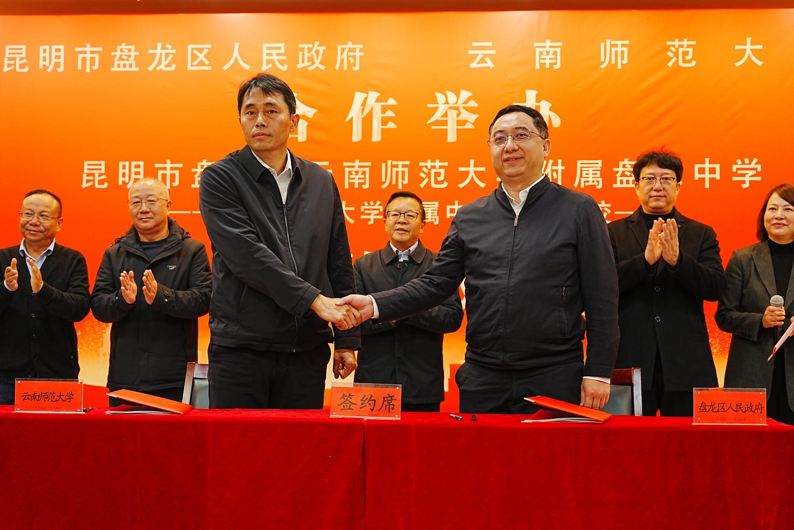 2025年11月18日,盘龙区人民政府与云南师范大学举行合作办学签约仪式,合作举办云南师范大学附属盘龙中学。云南师范大学副校长孟庆红,云南师范大学基础教育集团主任王玉光,云南师范大学附属中学校长孙毅,昆明市招生考试院院长李晏梅,盘龙区委书记沃磊,盘龙区委副书记、区人民政府区长张云以及校地双方相关领导出席签约仪式,盘龙区人民政府副区长蒋晓庆主持签约仪式。