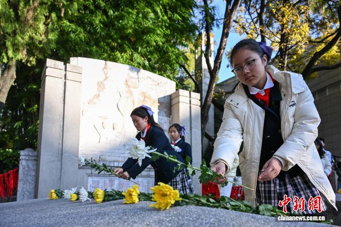12月1日,小学生在烈士墓敬献鲜花。中新社记者李嘉娴摄