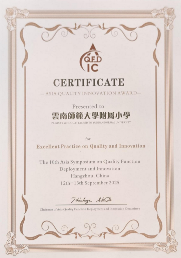 “亚洲质量创新奖”由亚洲质量功能展开协会(AQFDA)设立,是亚洲质量领域的重要奖项。云师大附小此次获奖,标志着其“质量赋能教育创新”的实践模式,为基础教育质量管理提供了可复制的新范式。