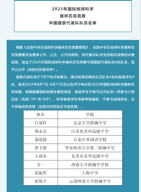 近日,云南师范大学附属中学高二物理1班张俊宇同学入选2025年国际地球科学奥林匹克竞赛中国国家代表队,这是云南赛区在该项赛事上首次有学生入选国家队。