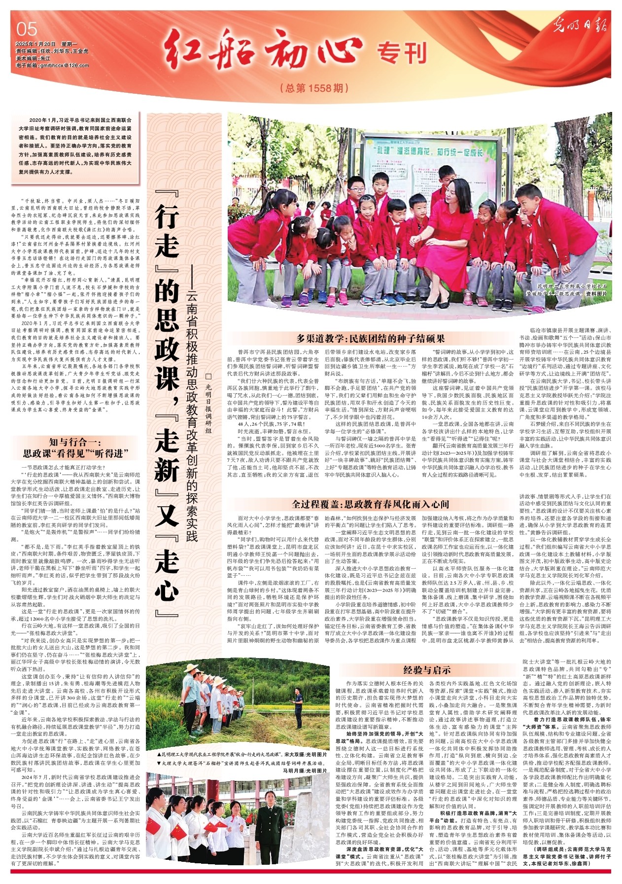五年来,云南省牢记殷殷嘱托,各地各部门各学校积极推动思政课改革创新,广大青少年学生听党话、跟党走的信念和行动更加自觉。日前,光明日报调研组一行深入云南各地大中小学,探寻云岭大地思政教育实践中形成的好做法好经验,看云南各地如何不断增强思政课的吸引力、感染力,引导学生扣好人生第一粒扣子,让思政课成为学生真心喜爱、终身受益的“金课”。