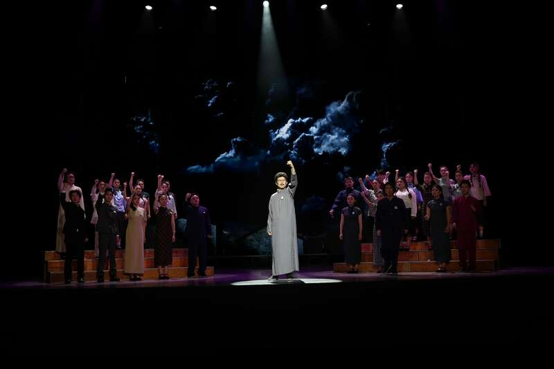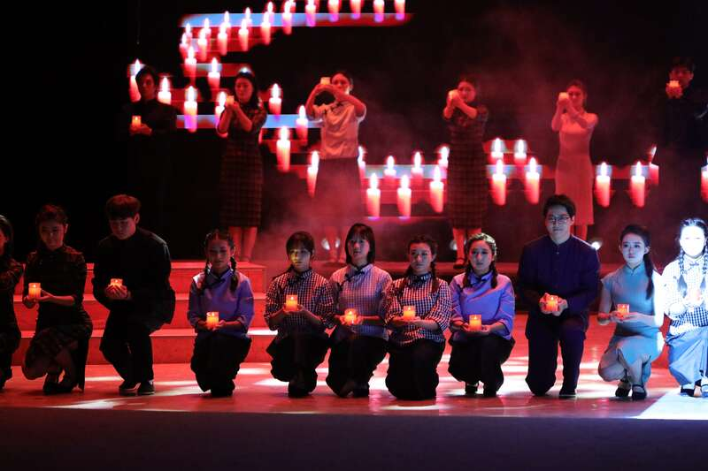 该剧突破了传统舞台局限,打造出“可听的戏剧”。通过密集枪声、空袭警报与集体朗诵的交织,构建起沉浸式的历史场域;动态投影技术同步呈现联大教室、硝烟街景、昆明城郊等场景,实现虚实结合,还原历史时空;演出尾声,《红烛魂》歌声响起,红色烛光漫溢全场,这极具冲击力的一幕让全场观众为之动容,深刻感受了一代学人的铮铮铁骨与家国情怀。